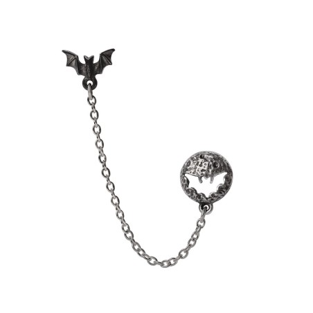 Elevate your ear game with our stunning 'Luna Roost' Moon and Bat Ear Jewellery, a truly unique piece that captures the mystique of the night sky. Handcrafted from fine English antiqued pewter, this enchanting design features a moon with a cut bat silhouette gracefully linked to a blackened bat by delicate chain.