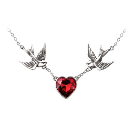 A pewter necklace chain of two opposed swallows linked to a central, red Austrian crystal heart.