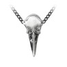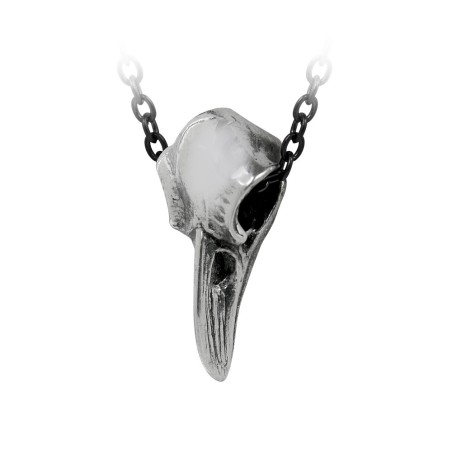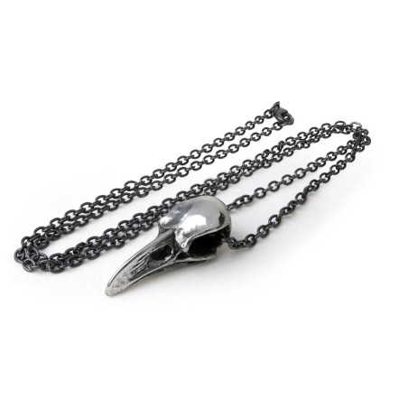 An authentically detailed miniature raven's skull pendant in polished pewter, suspended by the chain passing through the skull's eyes. ...