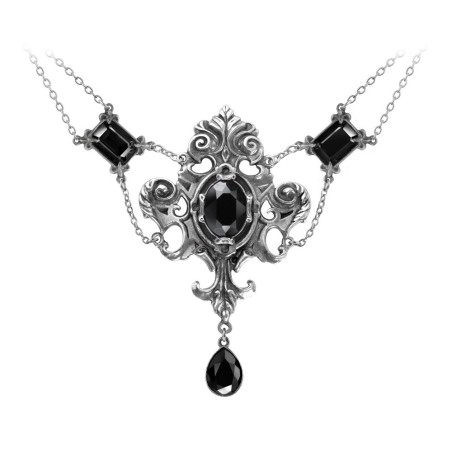 A pewter baroque-styled sculpted cartouche, flanked by matching stone-sets and finished with a crystal dropper. All set with black cut Austrian crystals.
