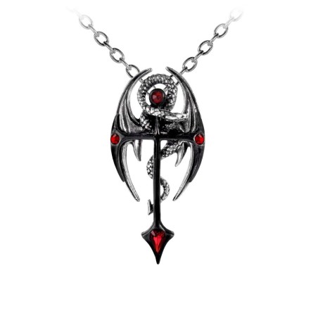 A pewter cross pendant enveloped by a dragon and set with four red Austrian crystals.