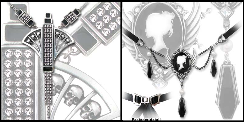 Add a twist of morbid sophistication with an Alchemy necklace like the Coffin Drop Cameo [P.608], which features Swarovski jewels and fastens with a delicate black ribbon. Or how about our exotic Folies Du Mort [P.614] from the vintage-inspired Deco Gothique range? It’s a real statement piece that’s decorated with tiny pewter skulls to make you stand out from the crowd.