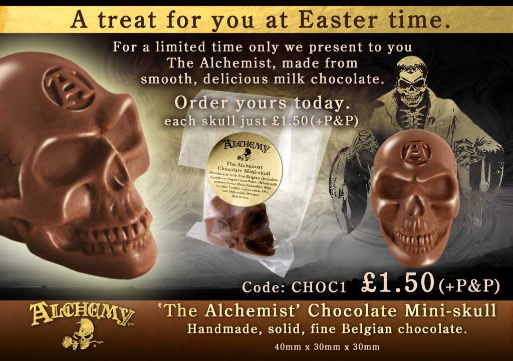 “The Alchemist Chocolate Mini-egg’ is hand moulded in the UK and is a 21 gram, solid, fine Belgian chocolate, measuring 40mm x 30mm x 30mm, supplied individually packaged in cellophane, at £1.50. Available from Alchemy England dealers, or directly from The Closet at Alchemy at: https://www.alchemyengland.com/site/index.php/product/the-alchemist-chocolate-mini-skull-choc-1/