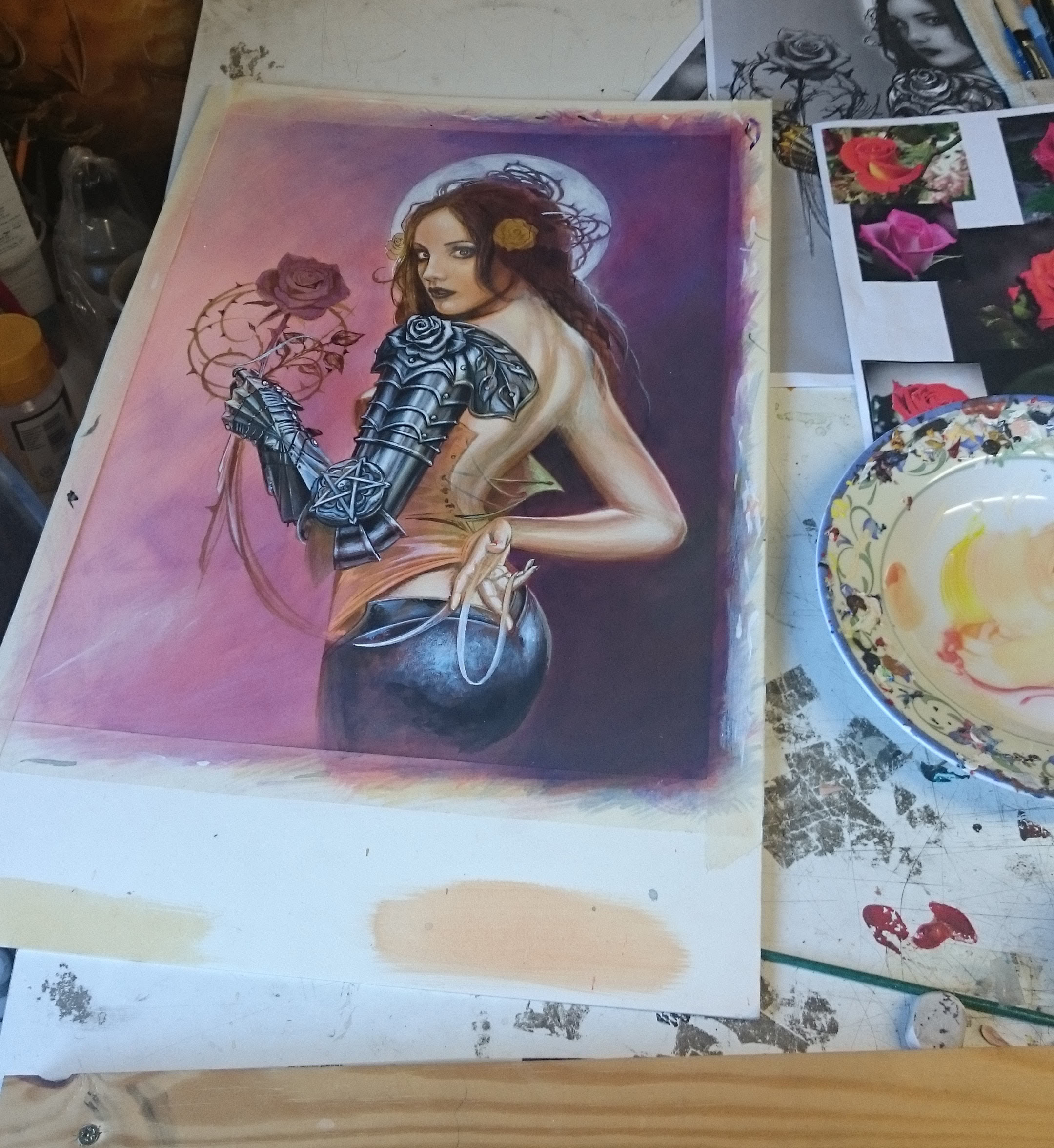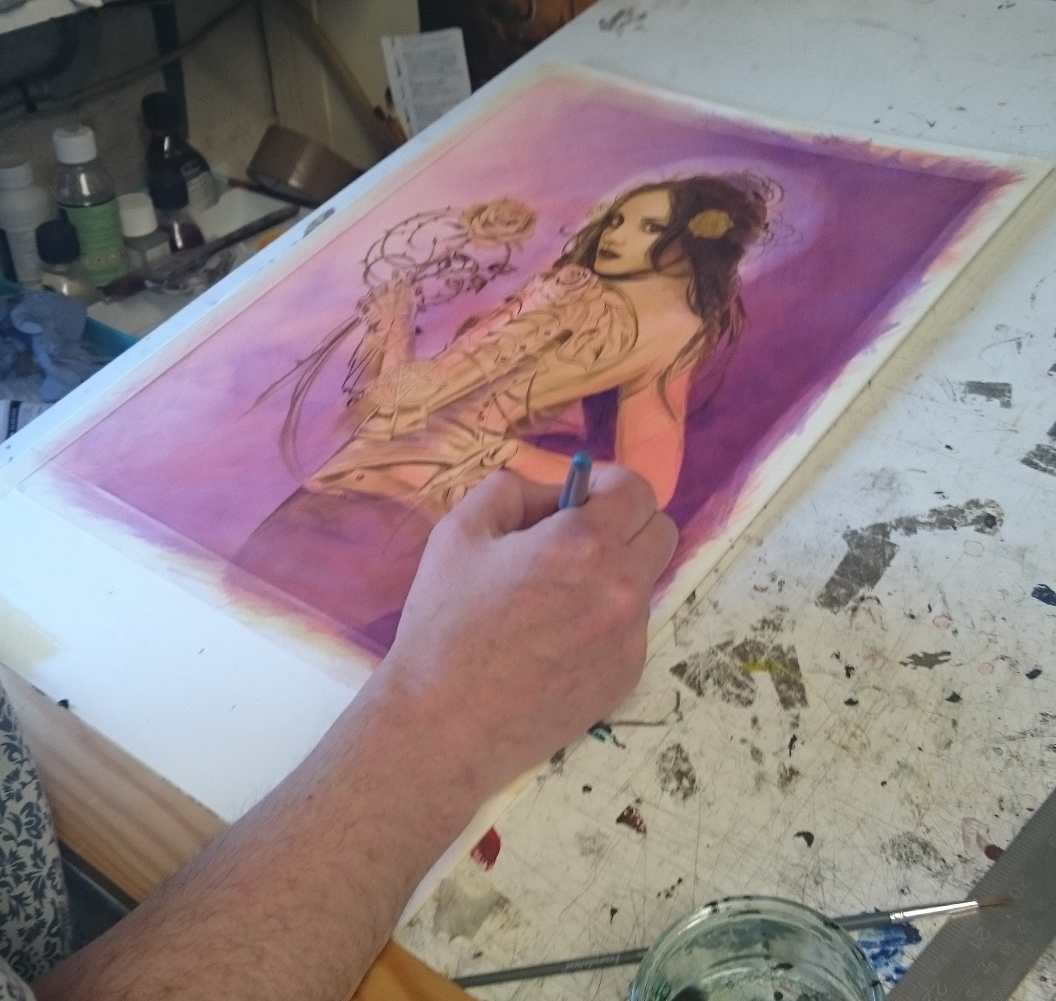 The painting techniques I utilized also looked back the style of the Pre Raphaelites, although with my necessity for commercial speed, I would replace oils with fast drying modern acrylic paints. Starting with a white board I gradually built up layers of shape and tone, before glazing colourful shades over the monochrome form beneath. Strangely for such a dark painting, there is no black paint involved, just warm fleshy tints over-glazed with rich purples and blues.