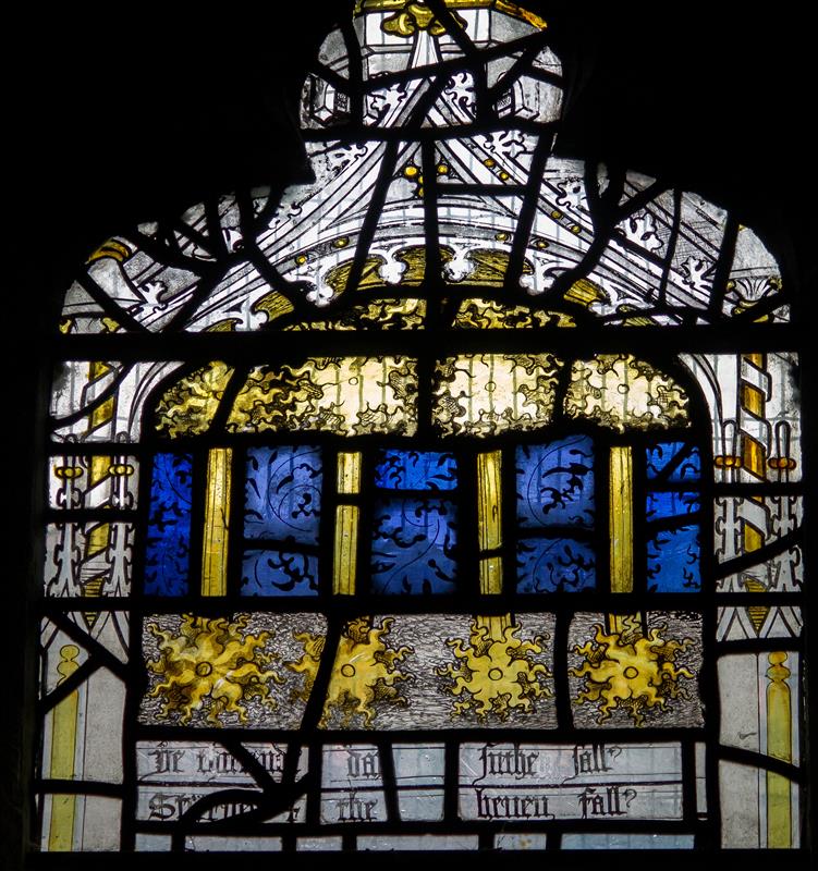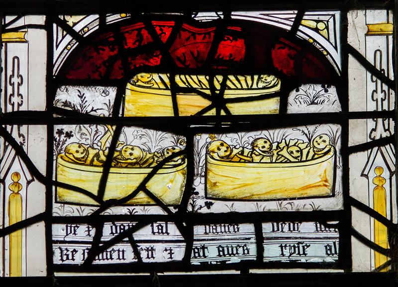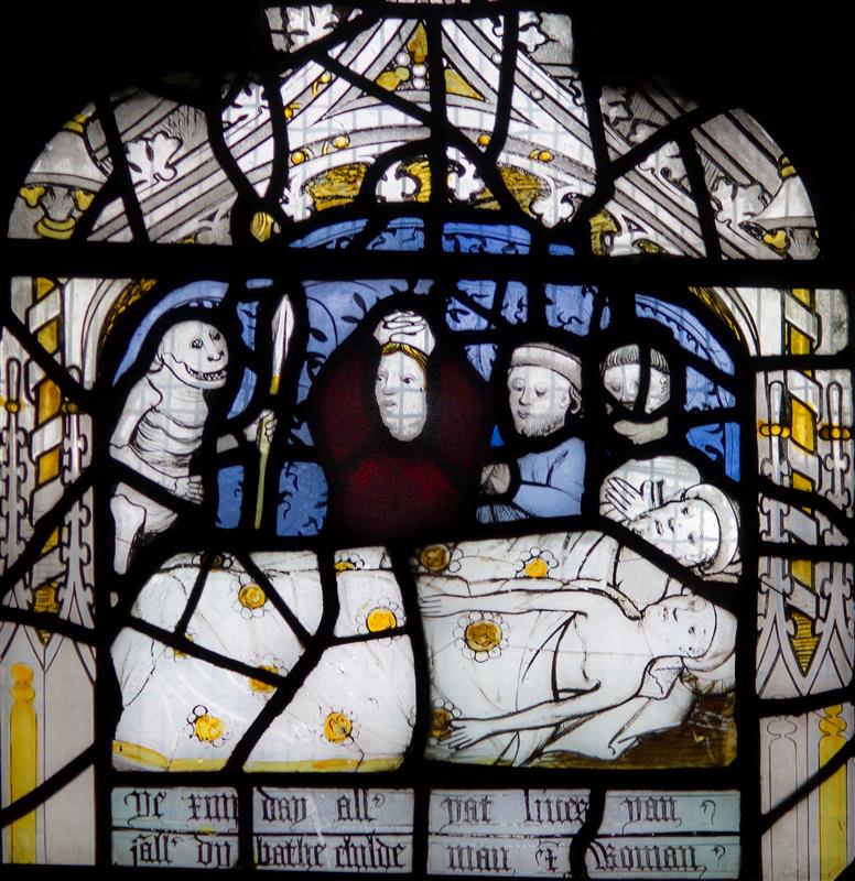 It is often known as the Prick of Conscience Window, after the Medieval English poem of that name. In the centuries before recorded music, verse often took its place as popular entertainment, and the Prick of Conscience was the smash hit of the 14th Century. Based around the prophecy of the Fifteen Signs of Doom, the poem was designed to inspire people to repent their sins by warning of imminent apocalypse, signified by fifteen terrifying phenomena. As it happened, disaster did strike the Medieval world shortly afterwards, but its agent was the plague in the shape of the Black Death, one of the few horrors not mentioned in the prophecy.