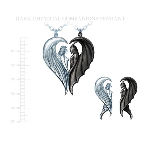 Over the last few years we’ve created a number of companion pendant sets. The novelty and romantic charge of the dual concept gives it a distinctive appeal. This design is based on a painting I made in the nineties, The Dark Chemical Wedding. At one point we translated the image directly into pewter as a pendant. It did very well for a time, but was discontinued in recent years, leaving an obvious gap for this companion version to emerge. The magnetic loins do carry a certain level of juvenile humour, but they also tie neatly into the mystic, alchemical narrative behind the piece.