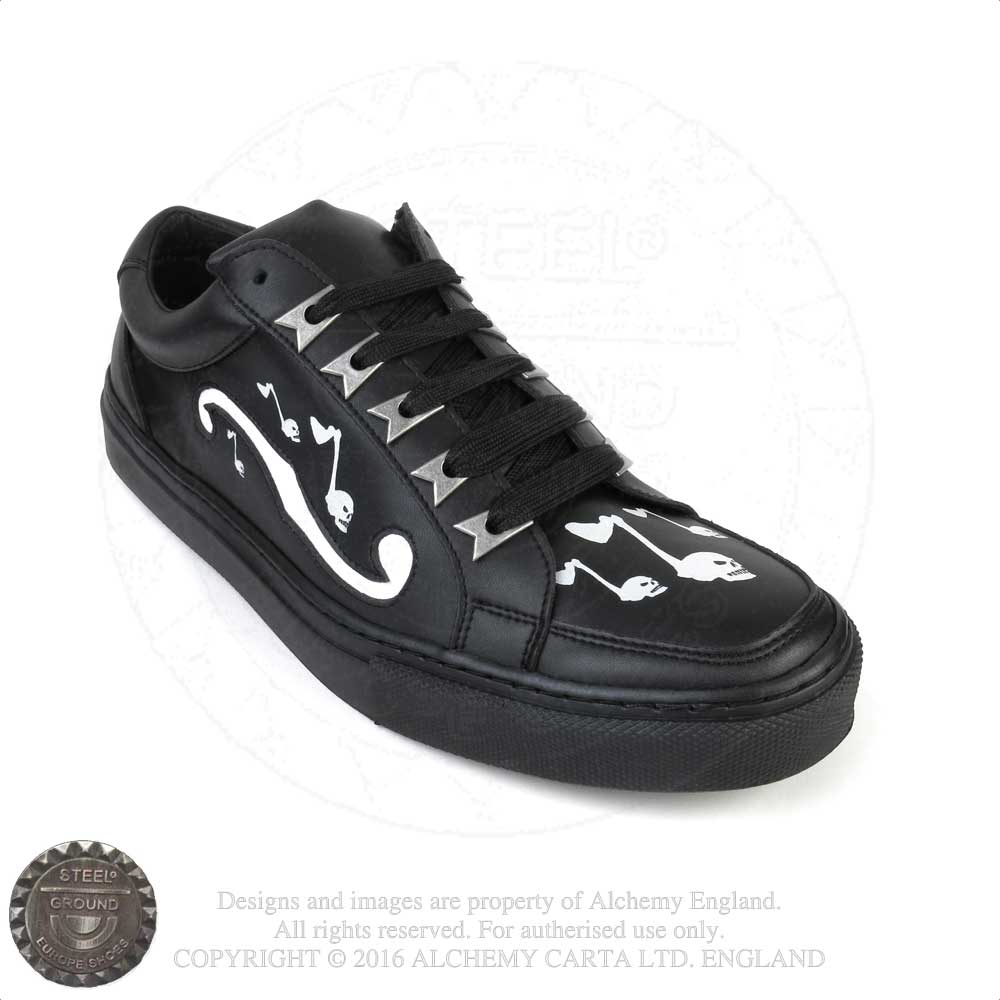 Thick padded tongue, white skull ’n bone note prints on the side and toe panels and a cut-out f-hole to outside; with black laces and antiqued metal fittings, (tailpiece eyelets and an AE brand badge on the instep).