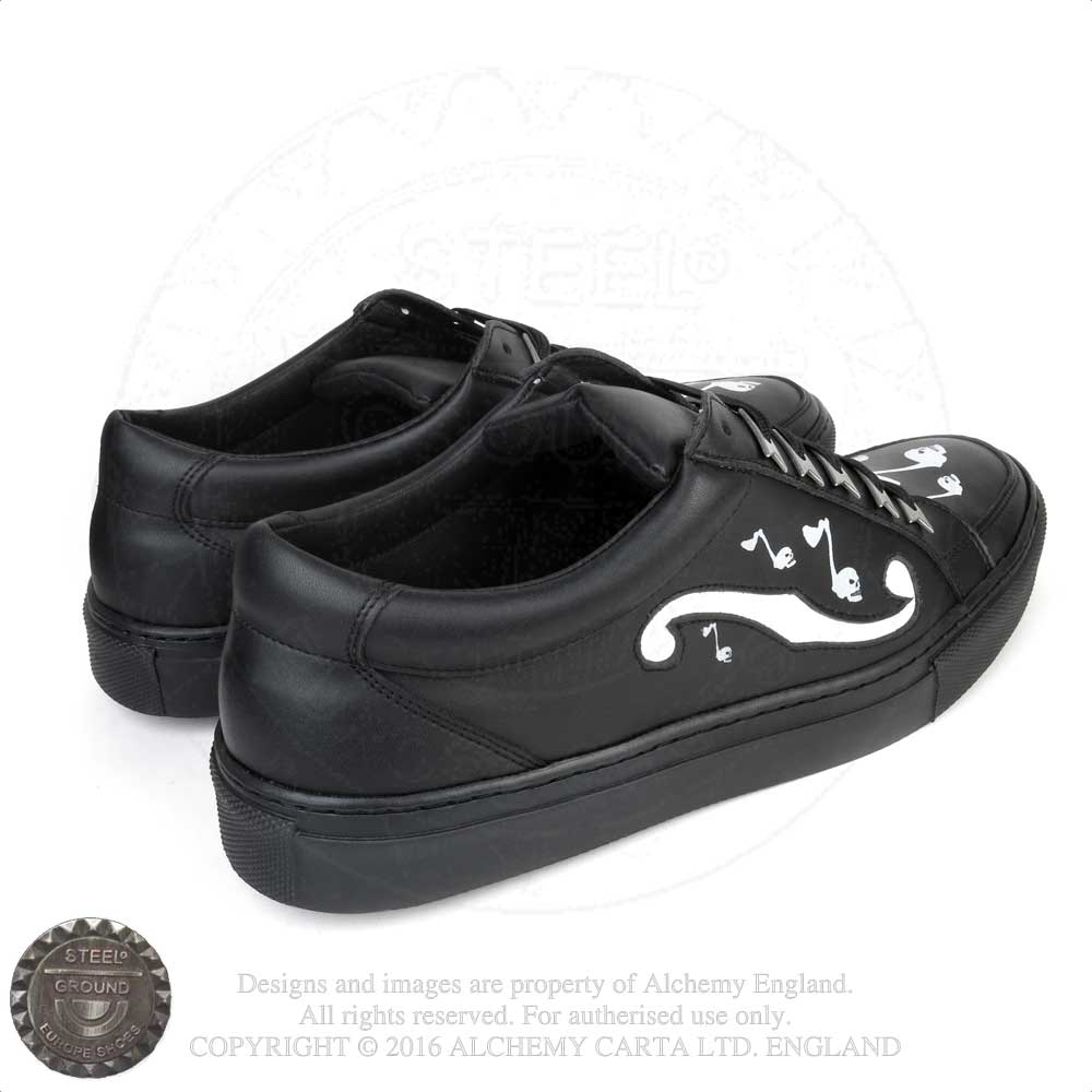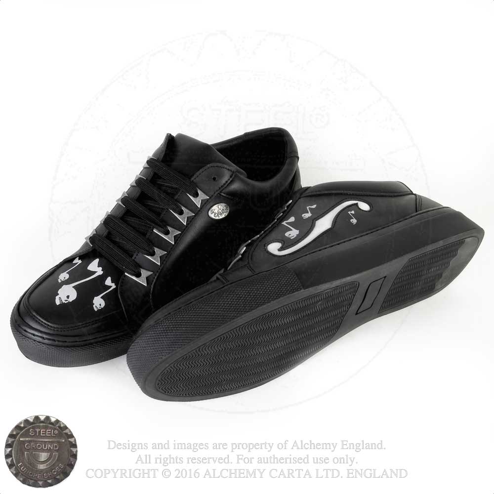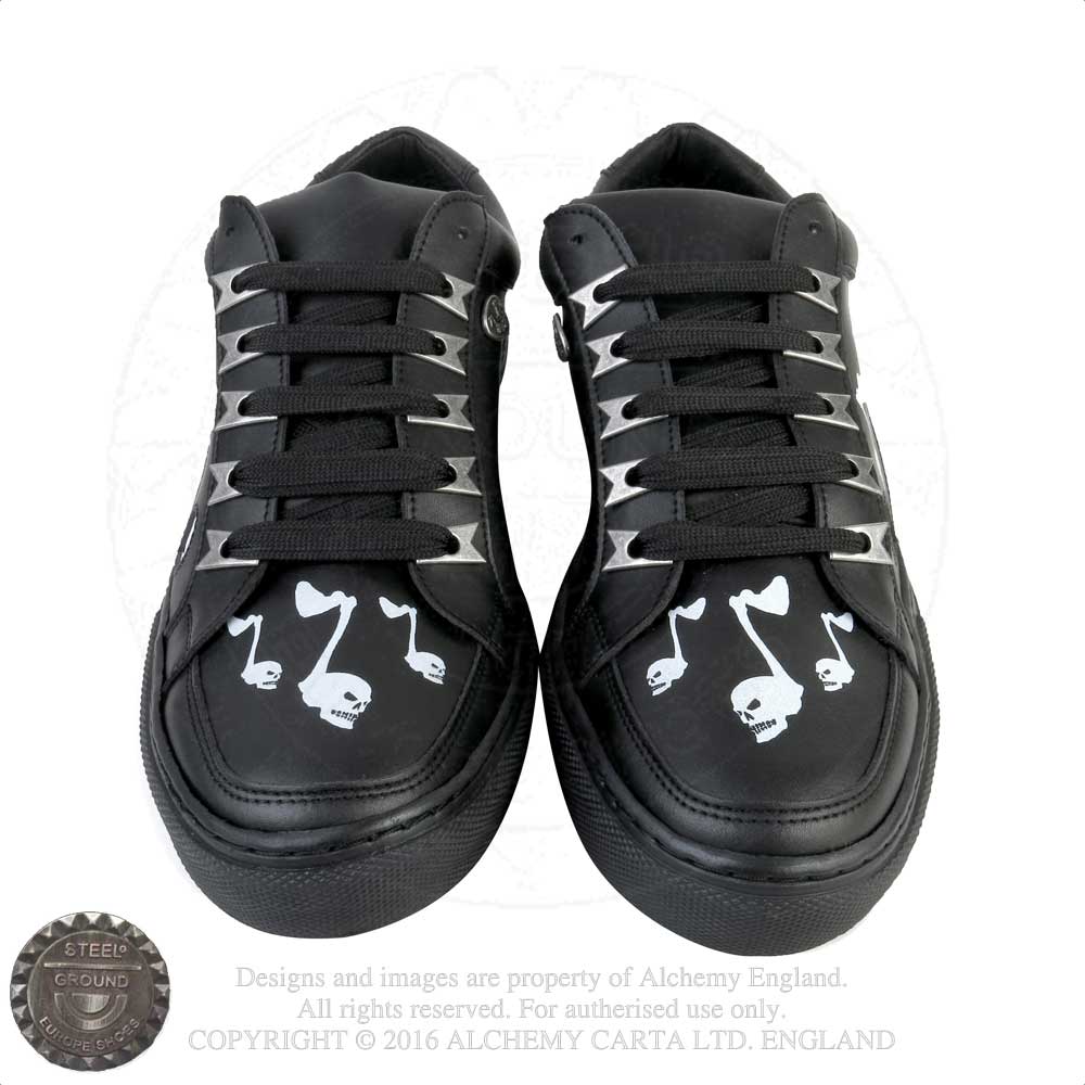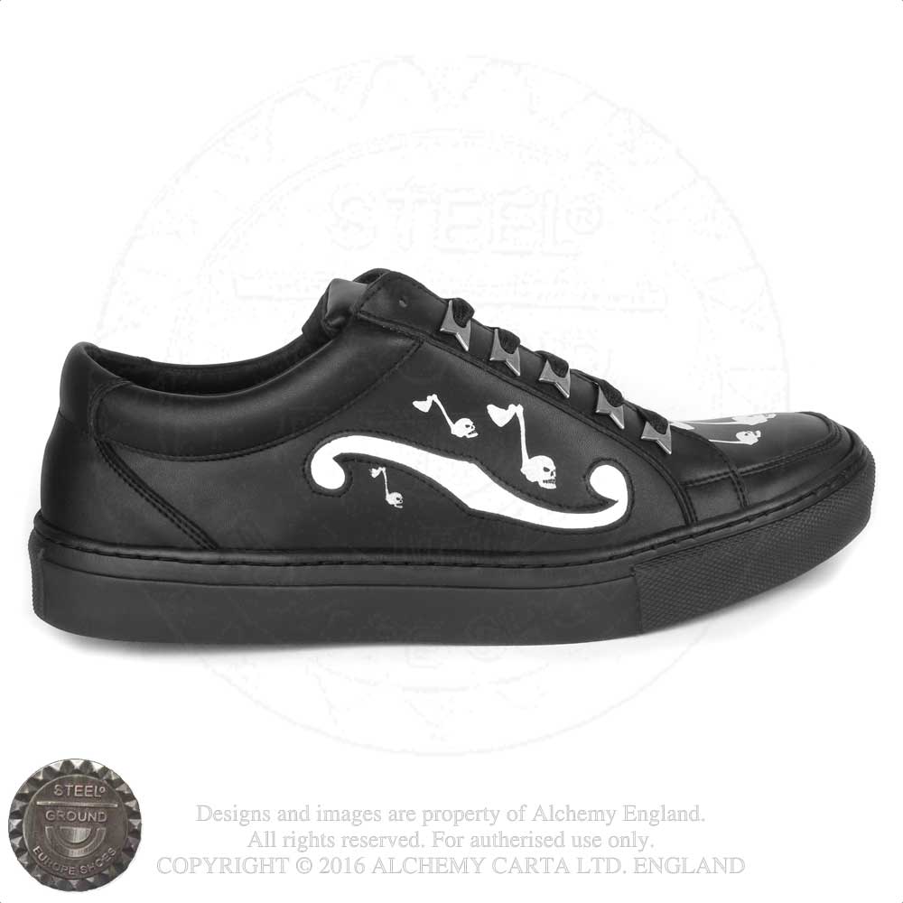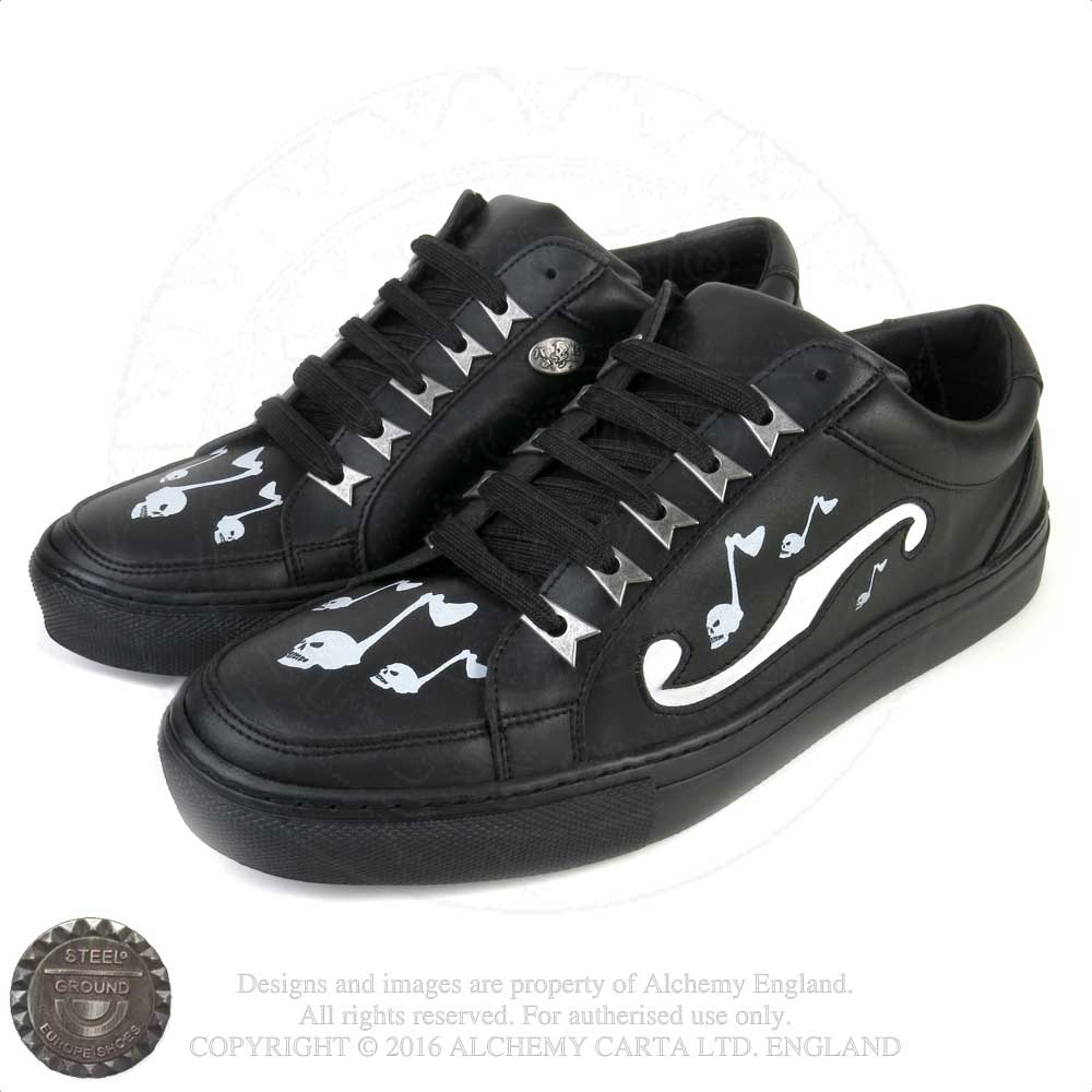 STS10BRockabilly & Rock ’n Roll culture is ingrained through these awesome, retro-style sneakers, with contrasting cut-out guitar f-holes in the side panels, skull ’n bone musical notes printed about and hollowbody guitar tailpiece metal eyelets for the laces.