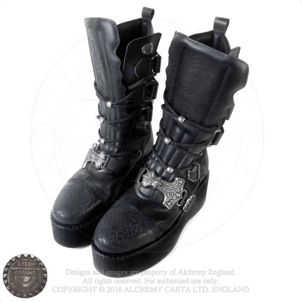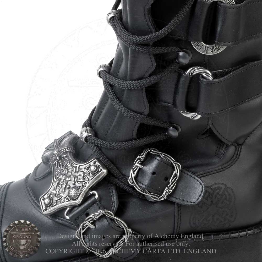 Black leather (or Vegan friendly pleather) boot engraved with Nordic knotwork on the toe cap and an entwined dragon on the front panel, and with decorative shoe lacing and antiqued metal fittings, (rune-engraved lace beads, rune-engraved and torque-twist strap rings, dragon knotwork buckles, a large decorated Thor’s hammer across the vamp and an AE brand badge on the inside upper collar).