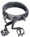 The cast pewter manacles are hinged with a steel pin and fastened with a spring pin on a safety chain, and feature two adjustable finger rings on generous lengths of ??? chain. Neck shackles are available in two sizes:Large 17"(431mm)Small 15" (380mm)