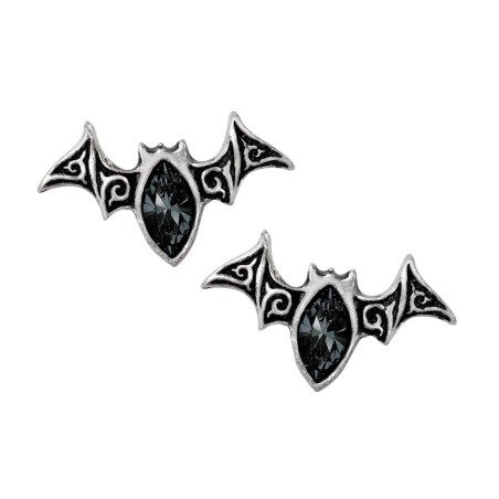 A pair of pewter ear studs in the form of small, stylised bats with vesica-shaped black diamond crystals; with surgical steel ear-posts.