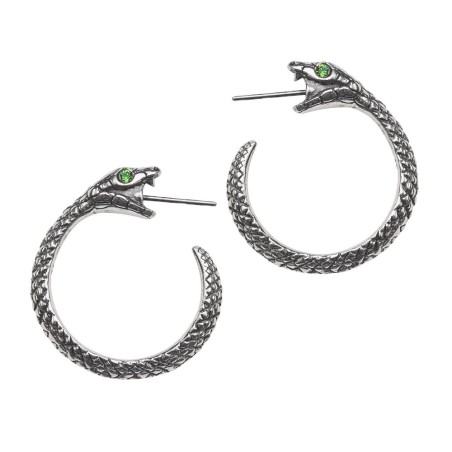 A pair of detailed, 1" (25mm) diameter pewter ear-hoops of a serpent with green Austrian crystal eyes, appearing to swallow their own tails when worn. ...